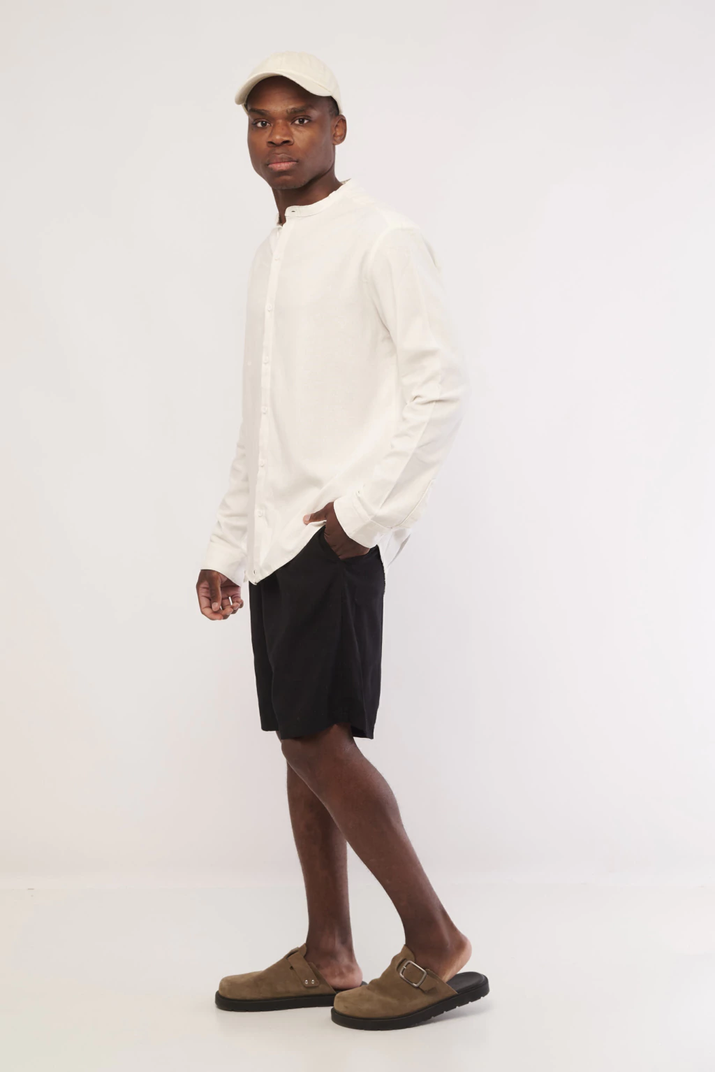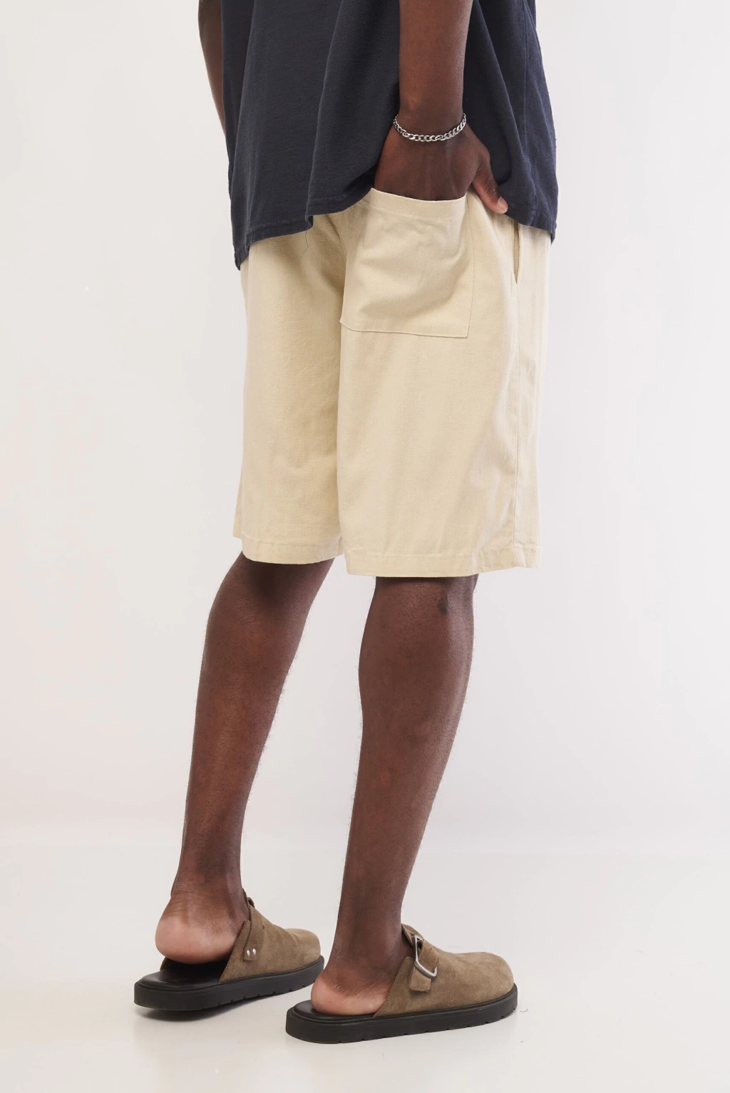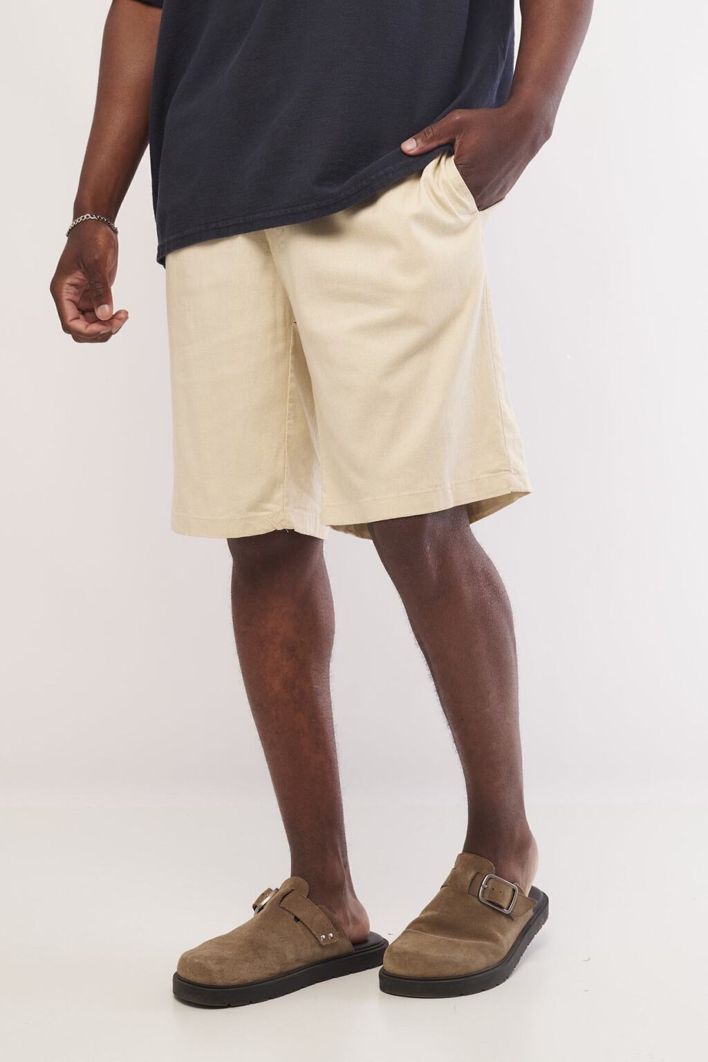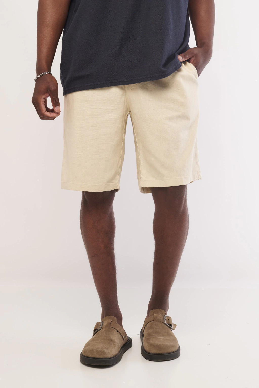 Bermuda de lino clásica, suelta y cómoda, con elástico y cierre que aseguran un calce perfecto.