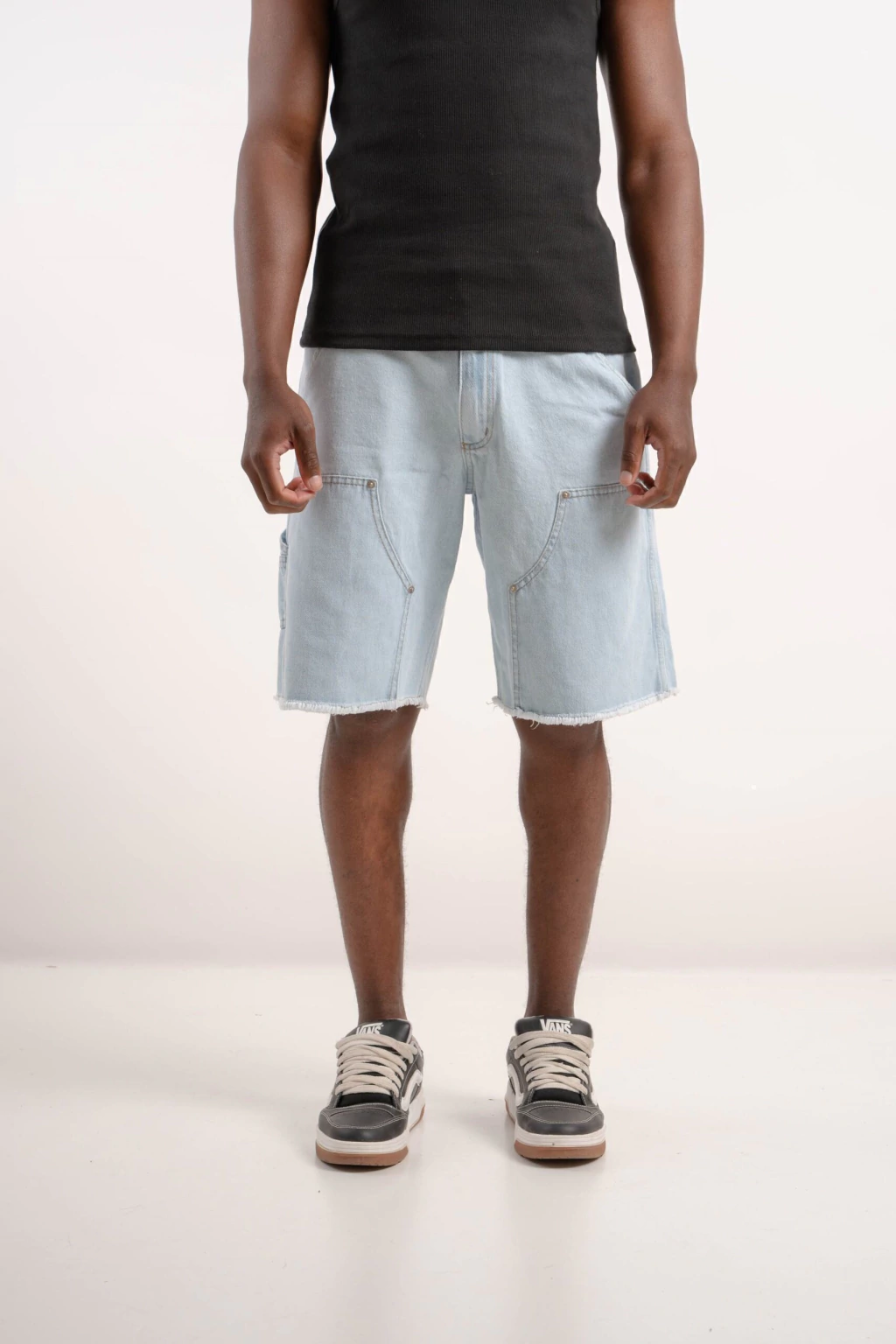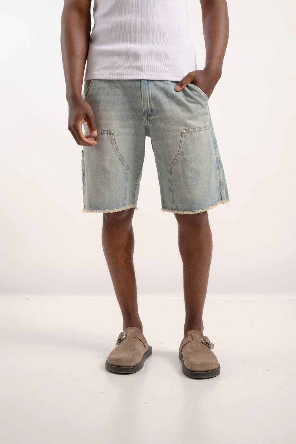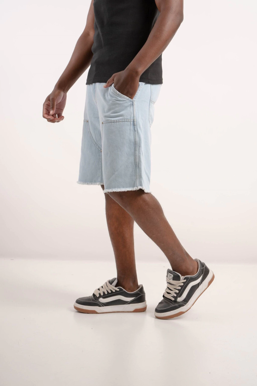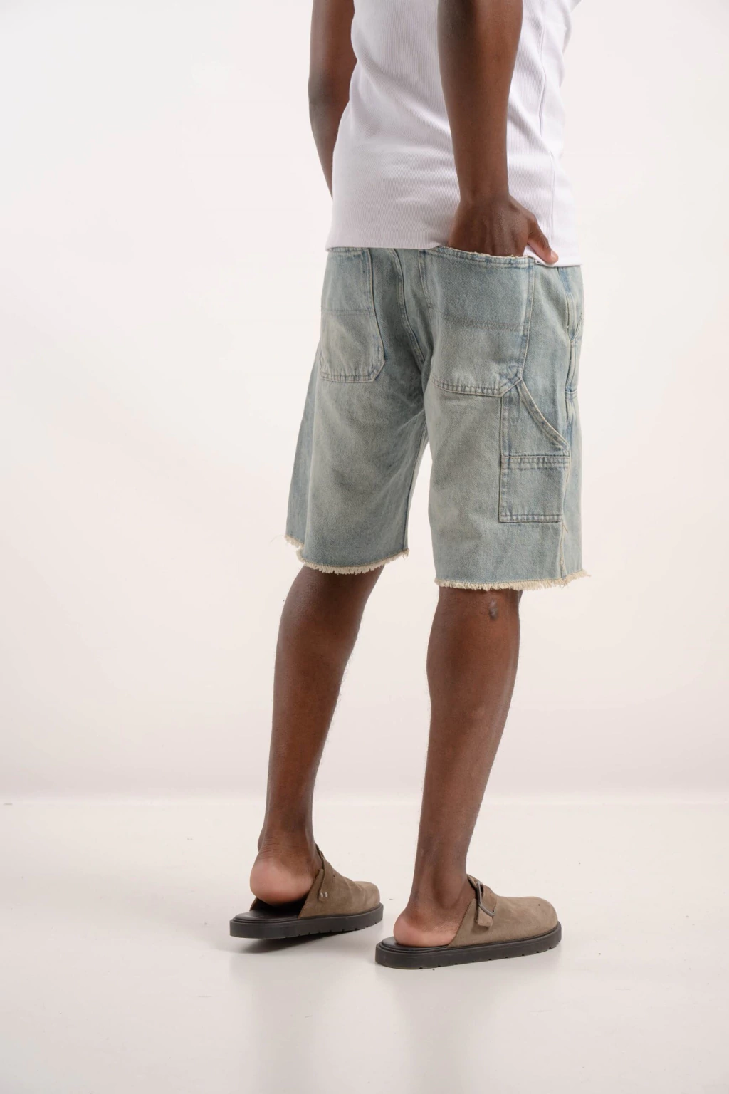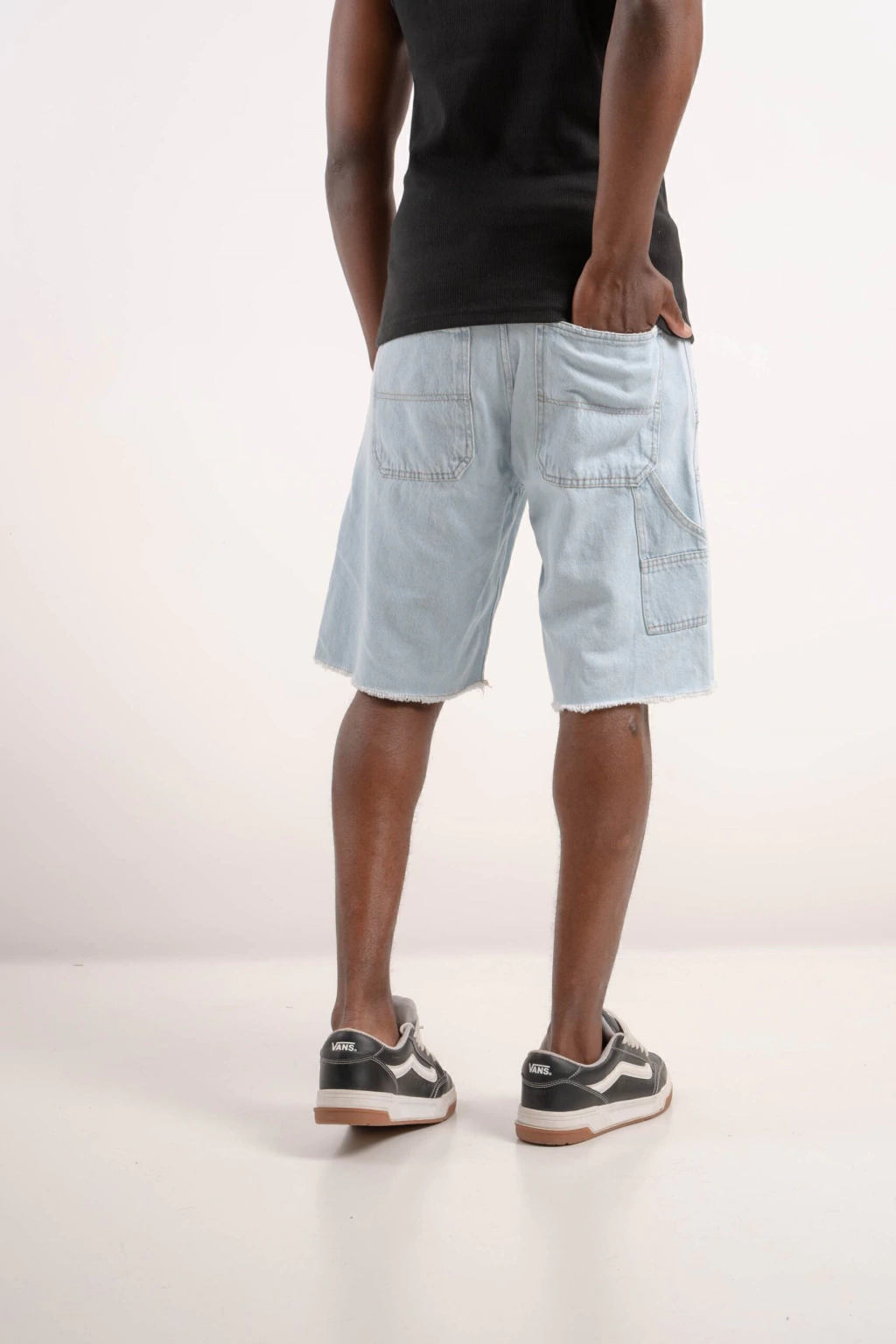 Bermuda de jeans rígido con corte relax, perfecta para un estilo cómodo y moderno. Destacan los flecos en las costuras inferiores y las costuras tipo carpintero que le dan un toque único y canchero.