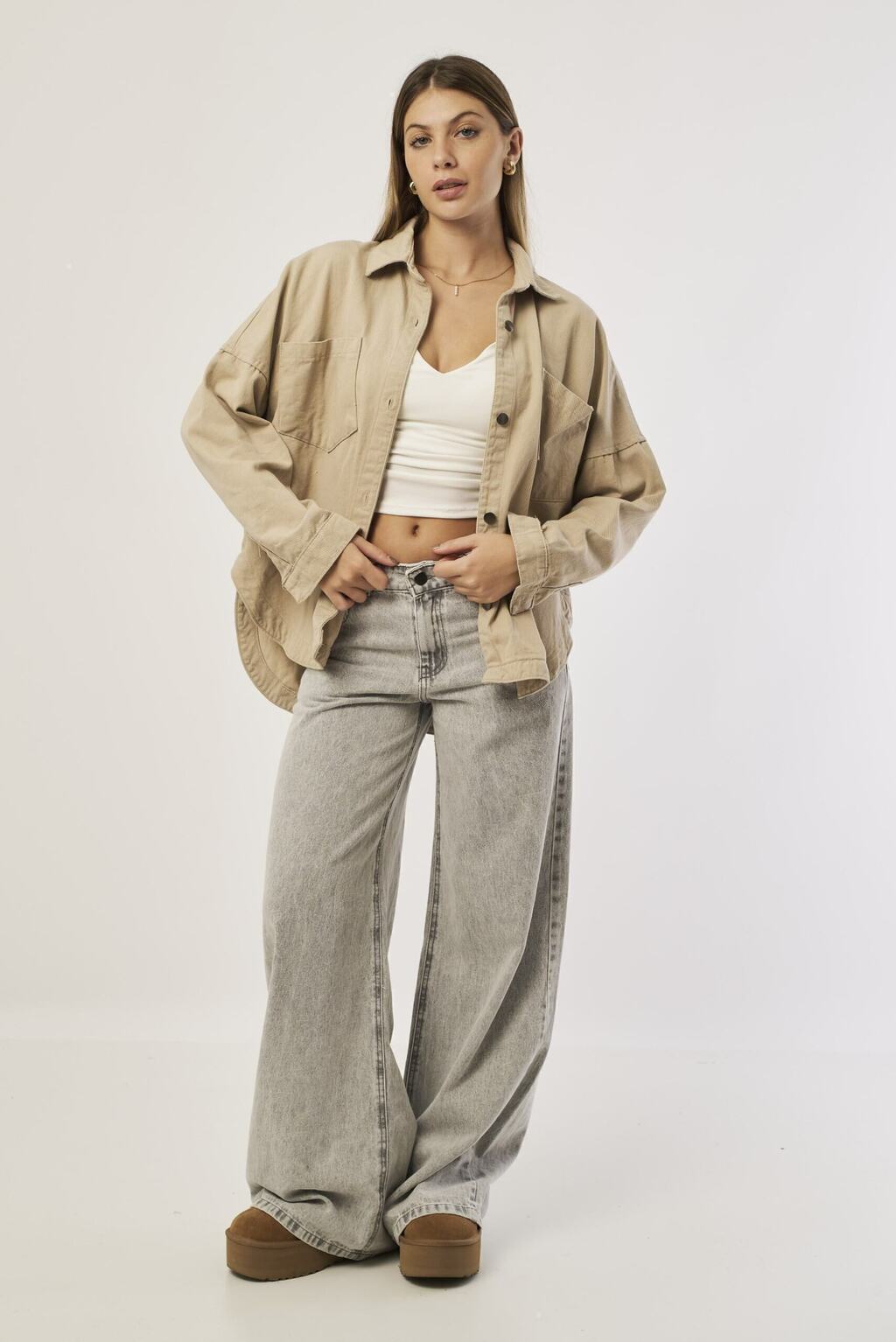 Campera oversize de jeans rígida con hombros caídos y bolsillos parche.