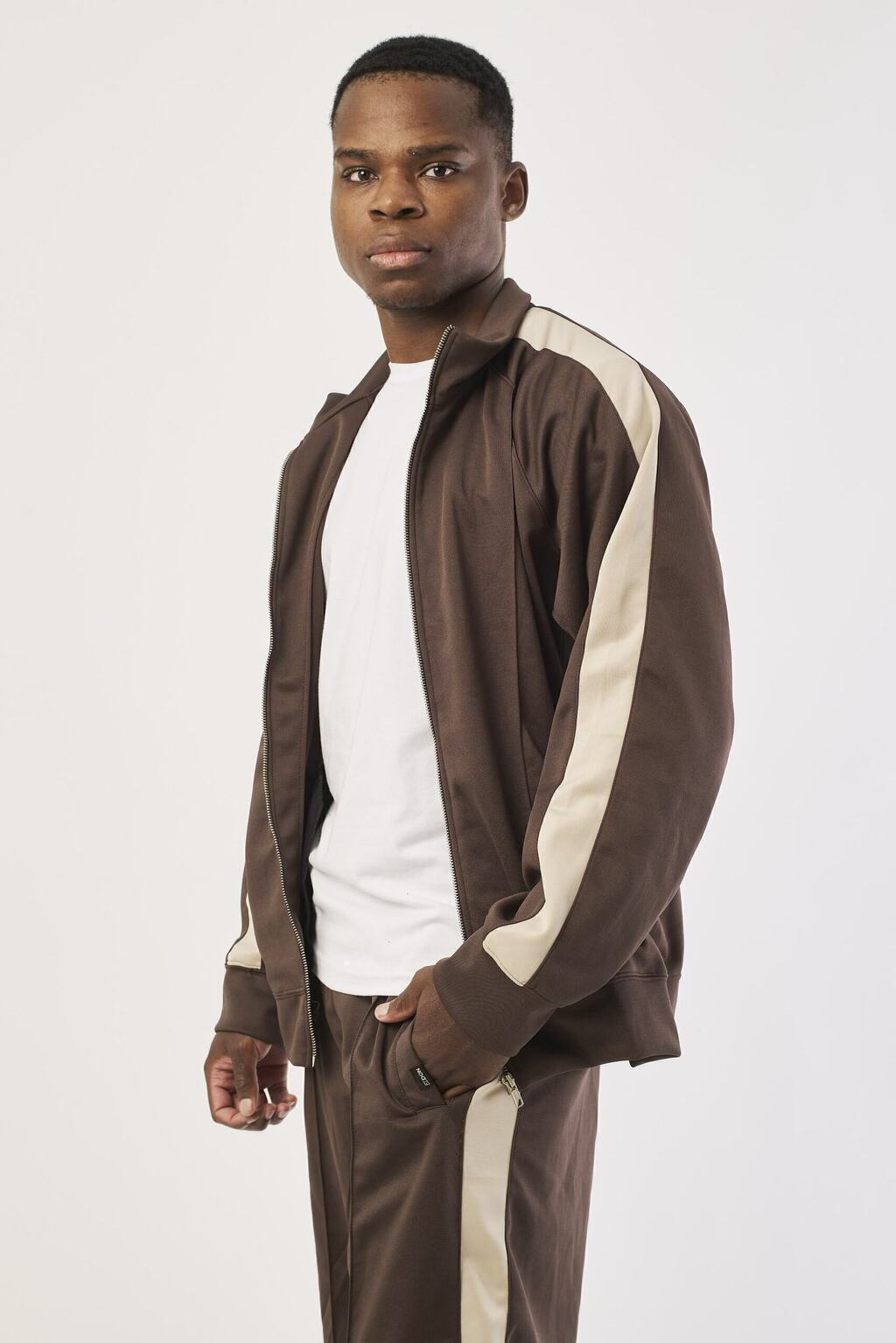 Campera de acetato regular fit, con mangas ranglan, recortes combinados y bolsillos laterales. Cintura y puños de tela base para un ajuste cómodo.