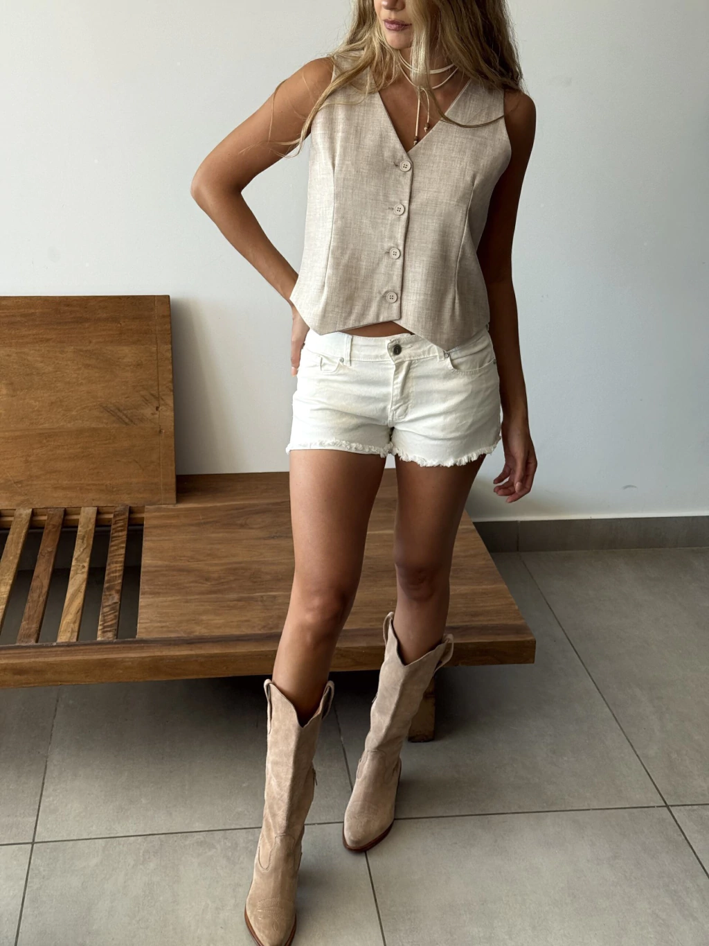 Chaleco sastrero con escote en V profundo. Un diseño sofisticado y versátil que aporta estilo y elegancia a cualquier outfit.