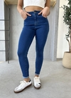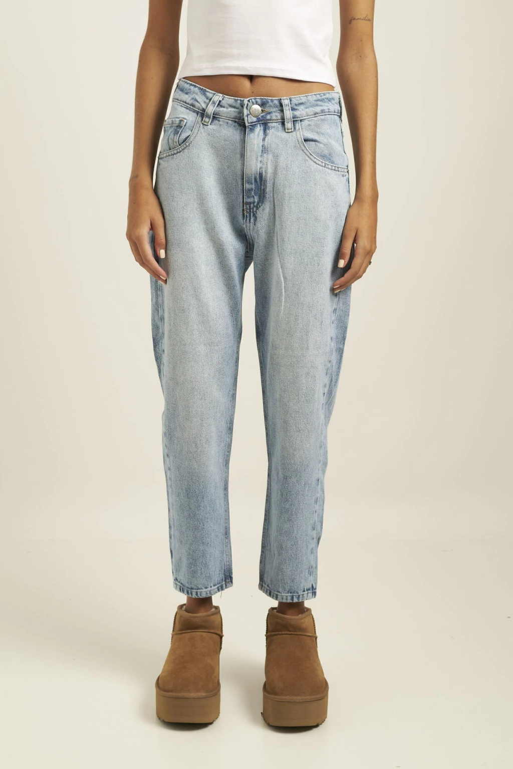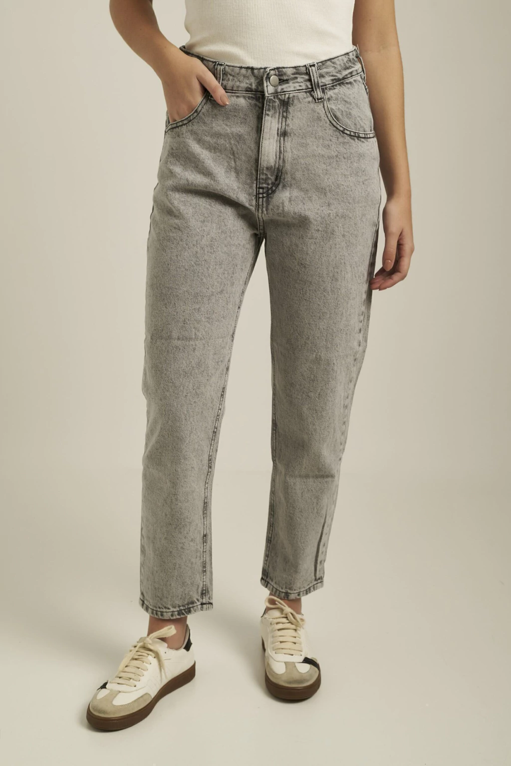 Mom fit tiro alto de denim rígido. Diseño clásico con ruedo normal y calce relajado en las piernas. Ideal para un look versátil y atemporal.