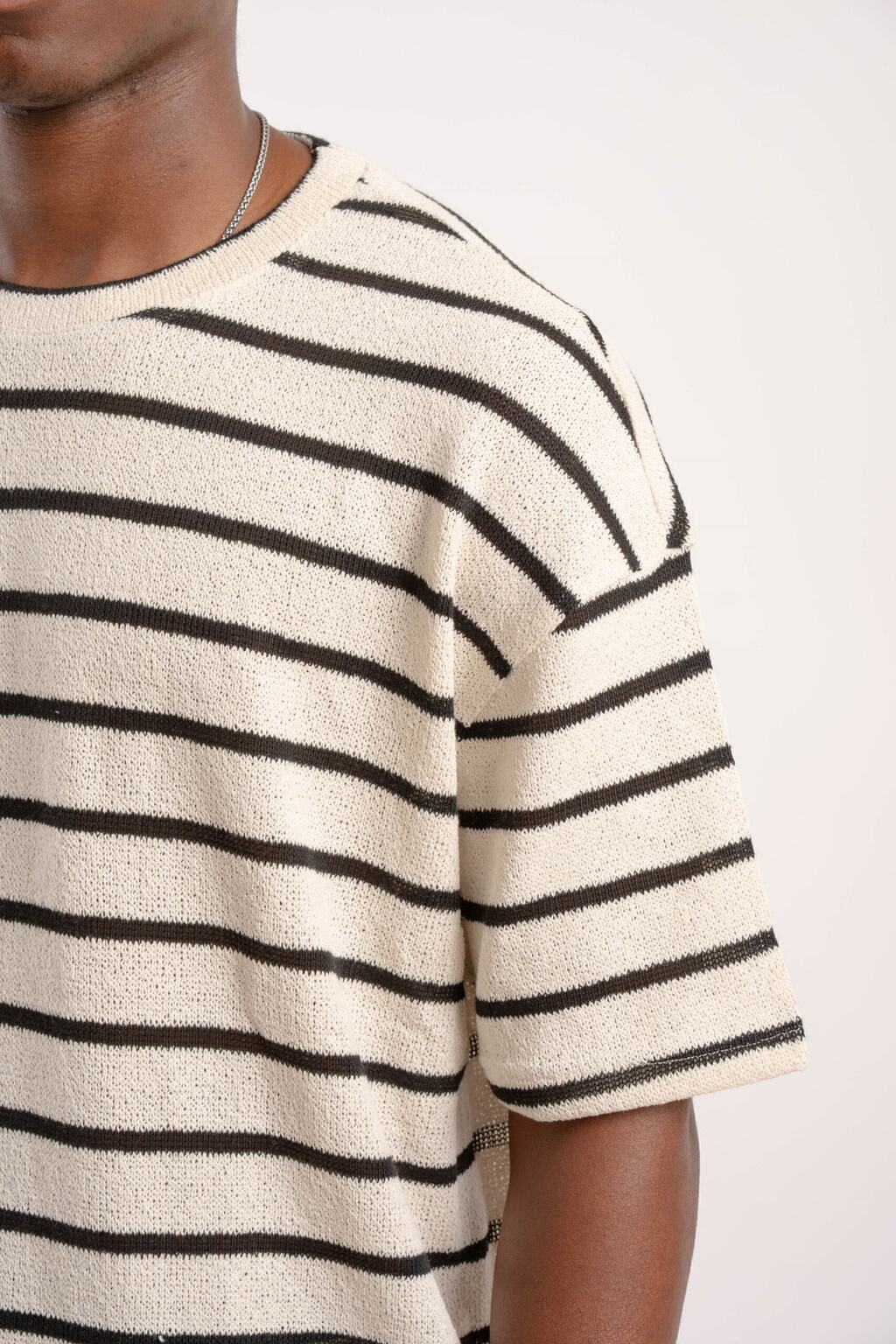 Remera de hilo tejida con rayas y corte boxyfit, perfecta para un look relajado y moderno. Su textura suave y diseño fresco la convierten en un básico ideal para cualquier ocasión.