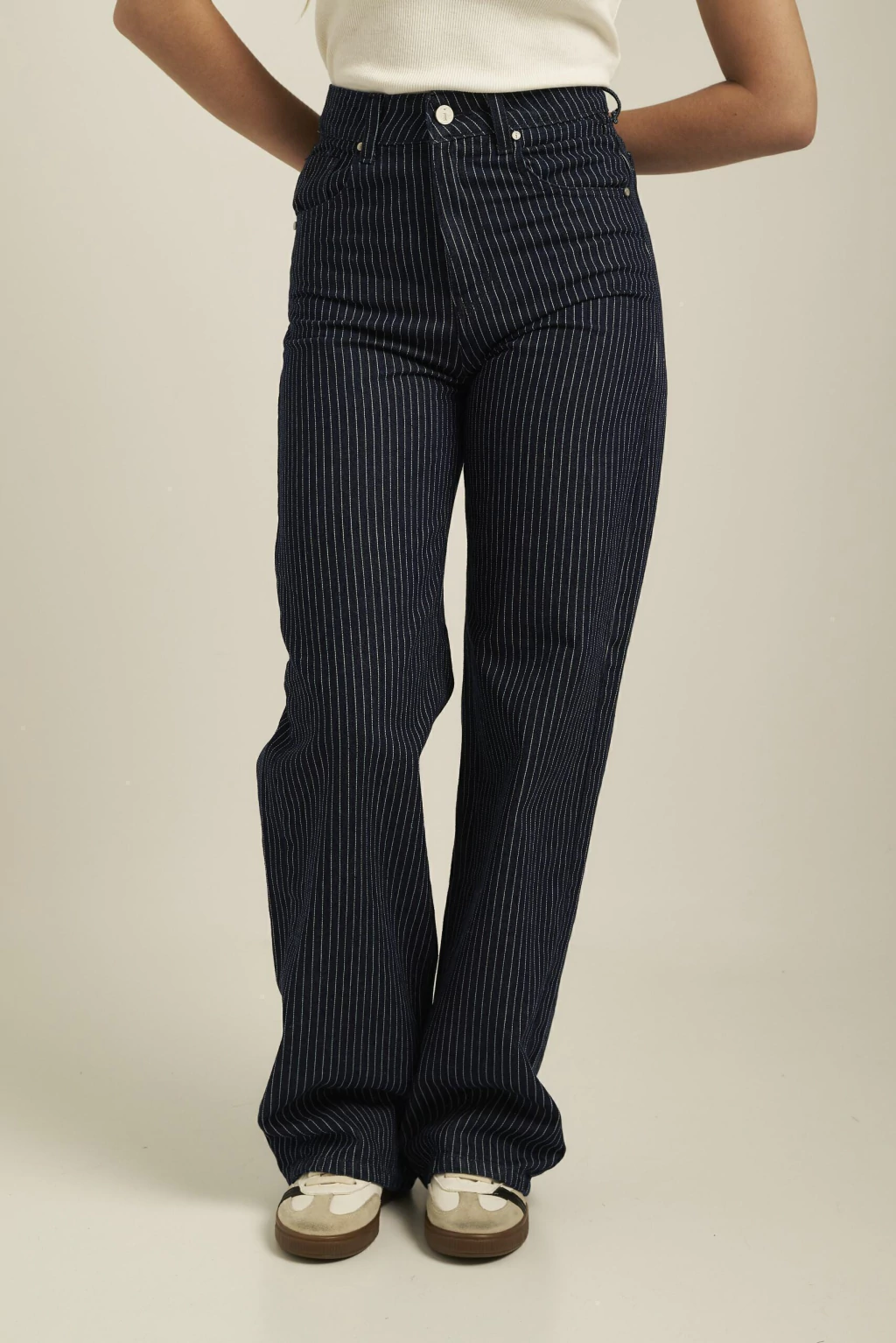 Wide leg rígido, tiro alto, con diseño a rayas y aplique en la cintura. Confección clásica y ruedo normal, ideal para un look moderno y versátil.