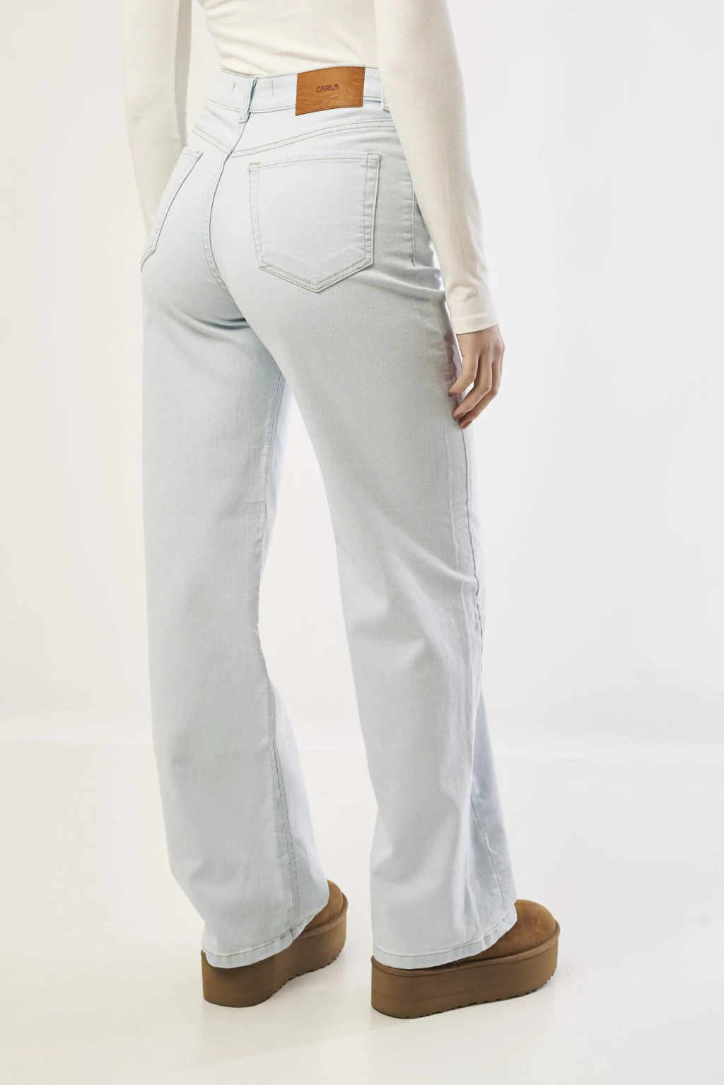 Pantalón wide leg de jeans elastizado y tiro alto, con costuras a contratono que le dan un toque único. Súper cómodo para armar looks modernos y relajados.